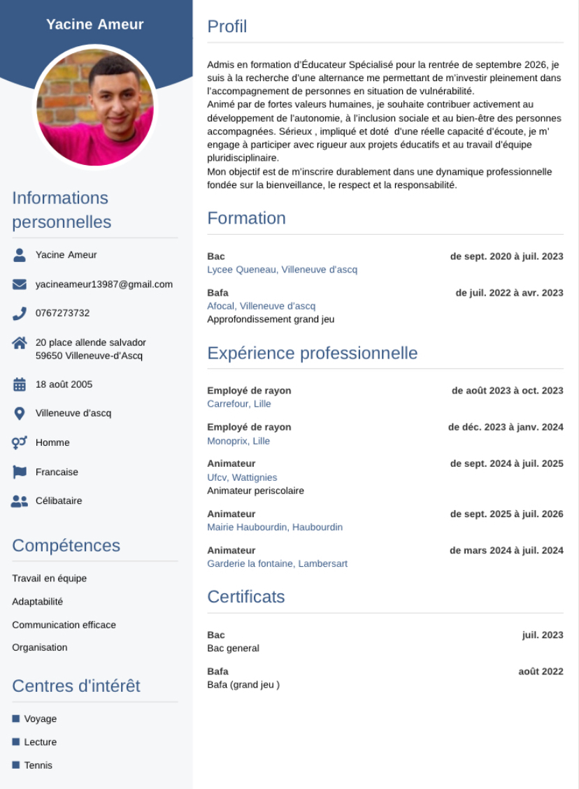 Admis en formation d’Éducateur Spécialisé pour la rentrée de septembre 2026, Yacine cherche une alternance lui permettant de s’investir pleinement dans l’accompagnement de personnes en situation de vulnérabilité.
